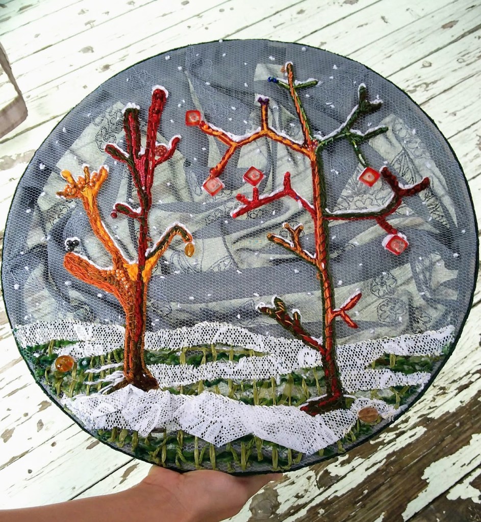 Une de mes premières broderie. J’aime l’effet produit par l’arrière-plan en tissu ondulé que j’ai fixé derrière la toile transparente en brodant les flocons de neige.
