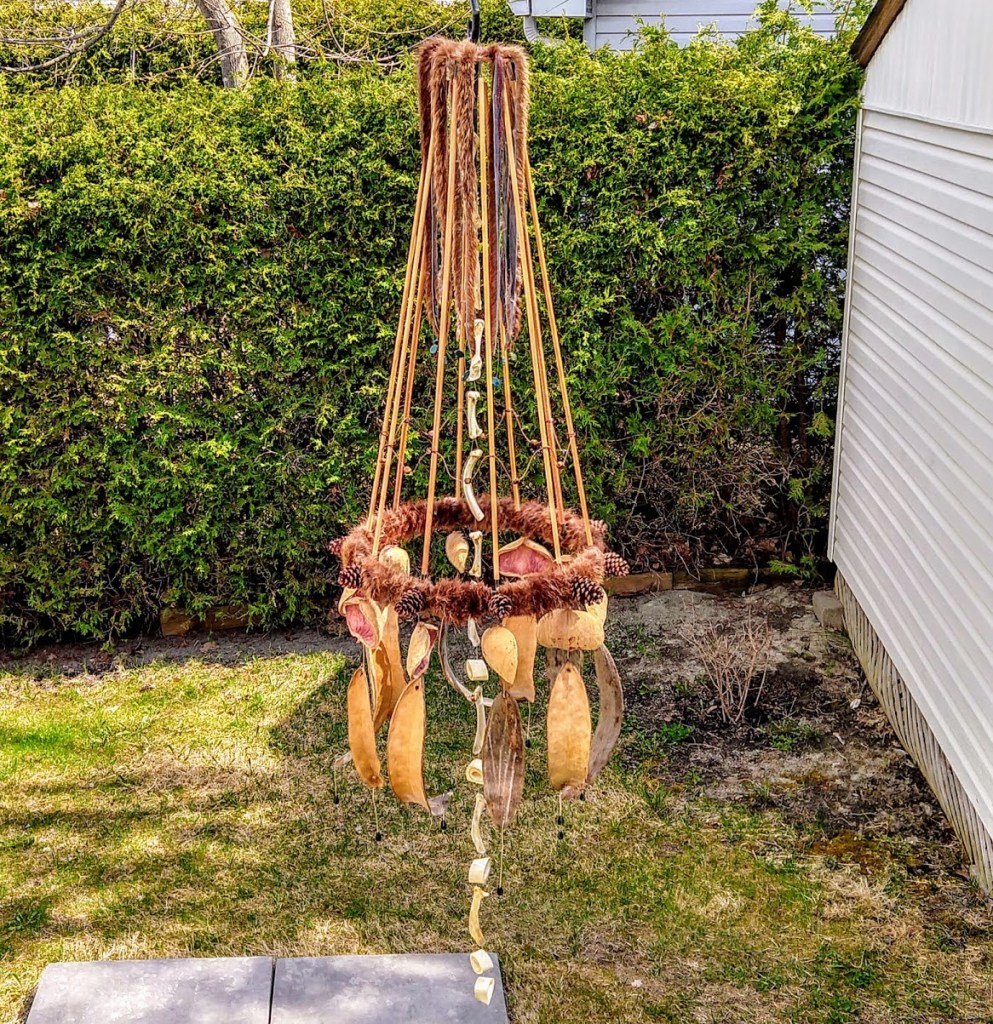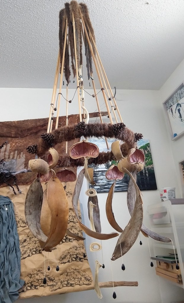 Ce mobile réunit les rejets des aliments que nous consommons (coques de fruits, os et fourrure.) Il évoque pour moi une alimentation plus primitive et rappelle une rapport plus direct entre l’humain et sa nourriture.