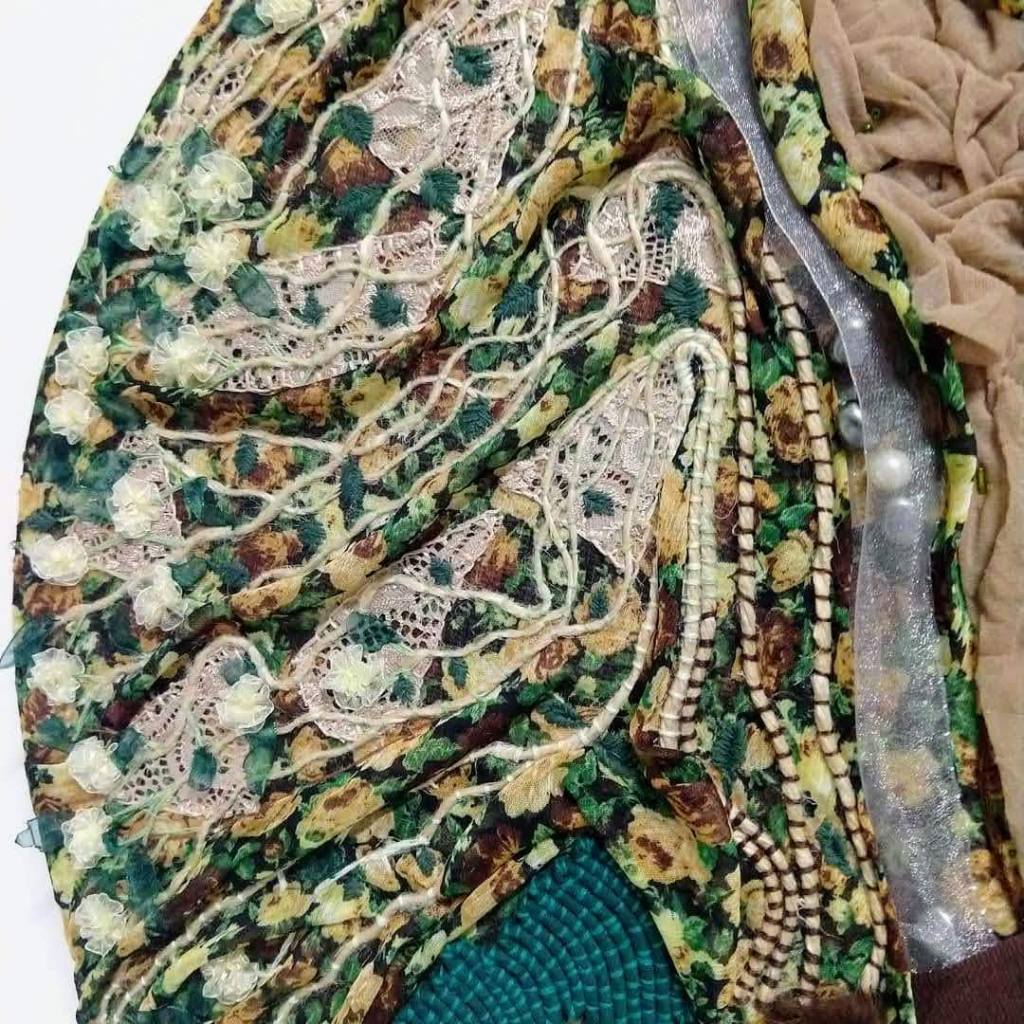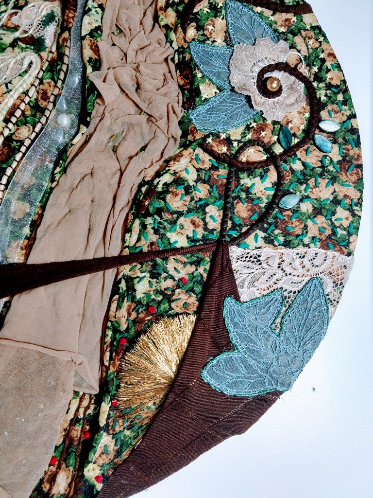 Dans cette broderie ronde, j’ai cousu des tissus fins sur la base en préservant les plis et les vallons qui impartissent un mouvement fluide à l’œuvre. J’ai ensuite remplis les creux de ficelle, de rubans, de billes et de petites fleurs en tissu. Aujourd’hui, ce relief cousu orne les murs d’une demeure en Indonésie.