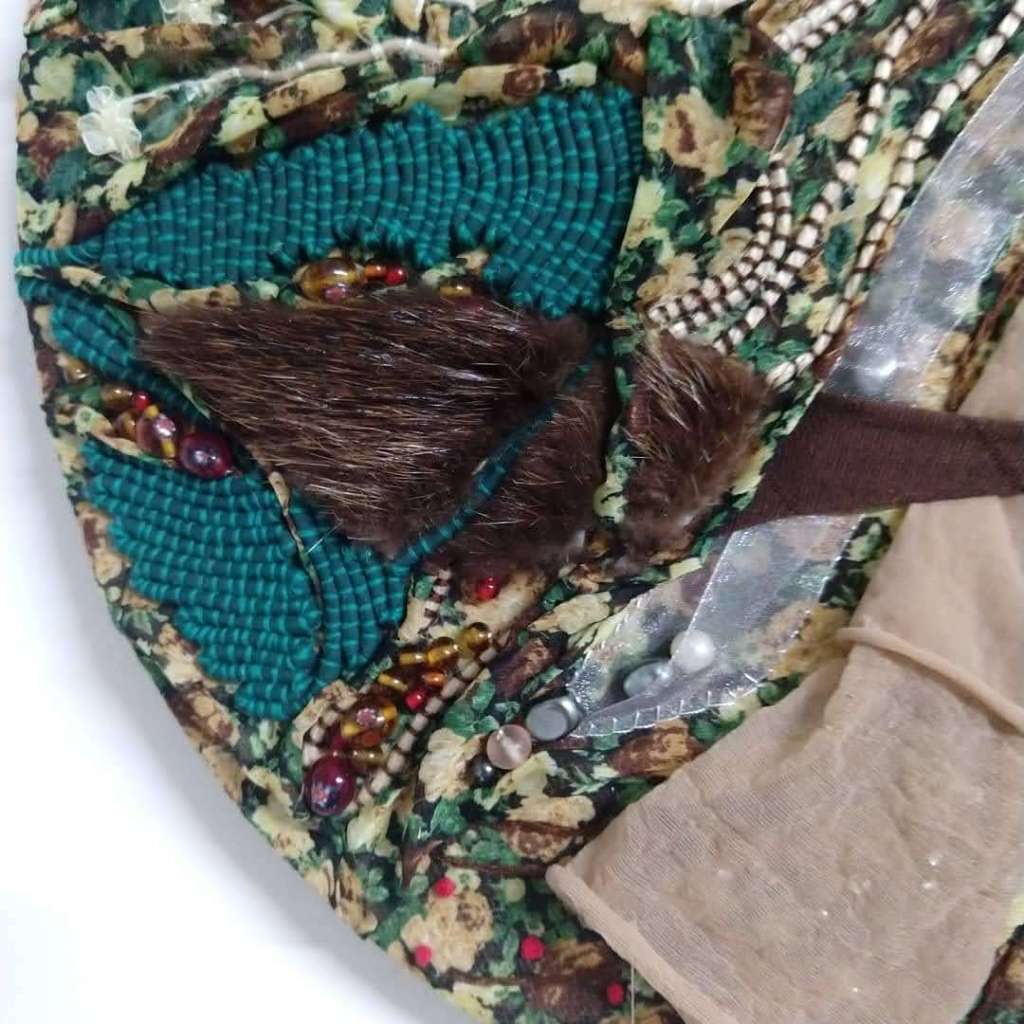 In this large round textured needle work I sewed fine fabric down, preserving the valleys and crevices that give this piece its fluid movement. Then I filled them with nylon, string, beads, ribbons and fabric flowers. Today, it decorates the walls of a home in Indonesia.