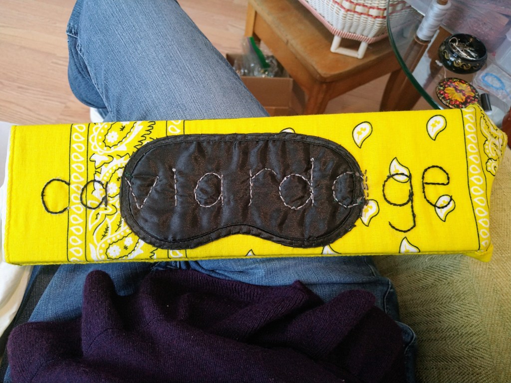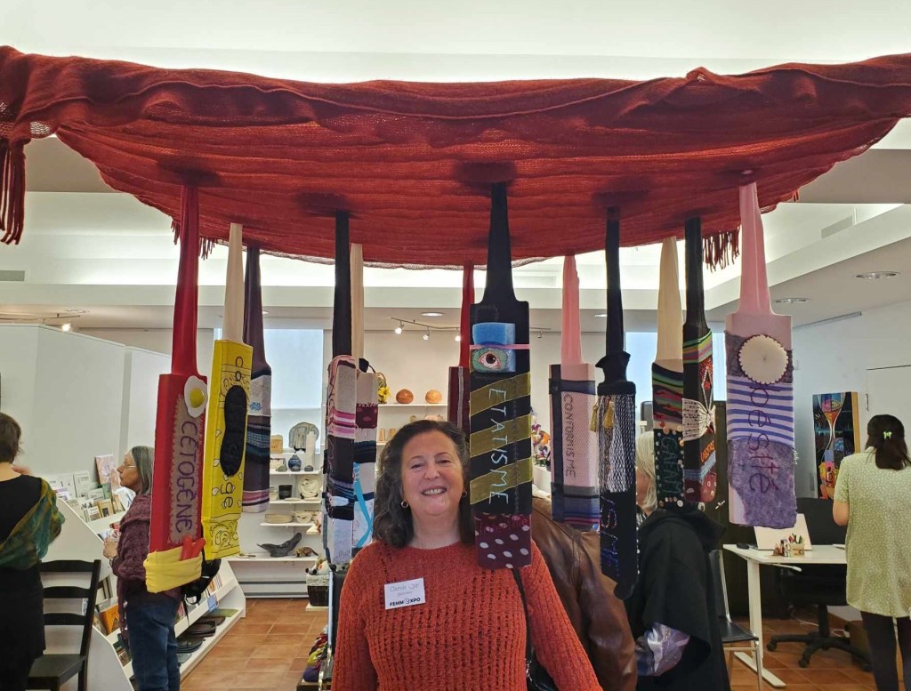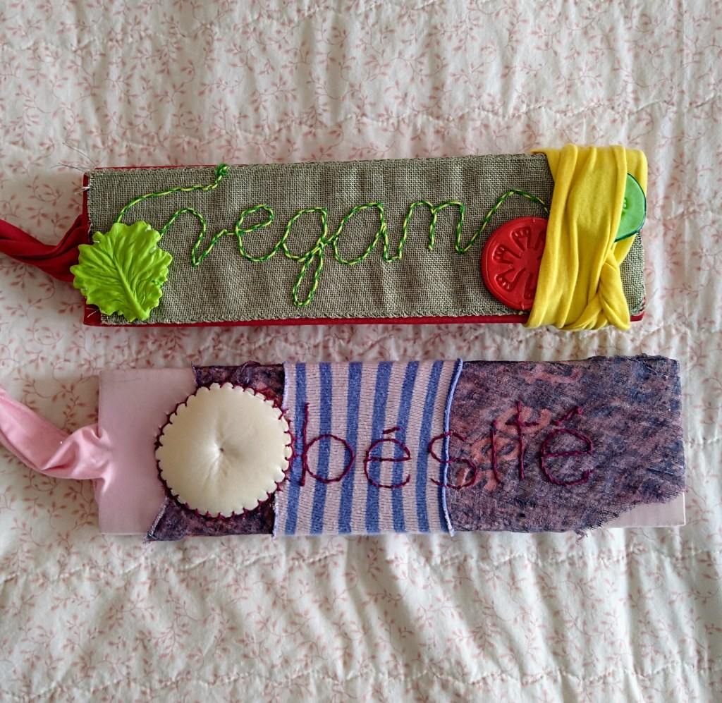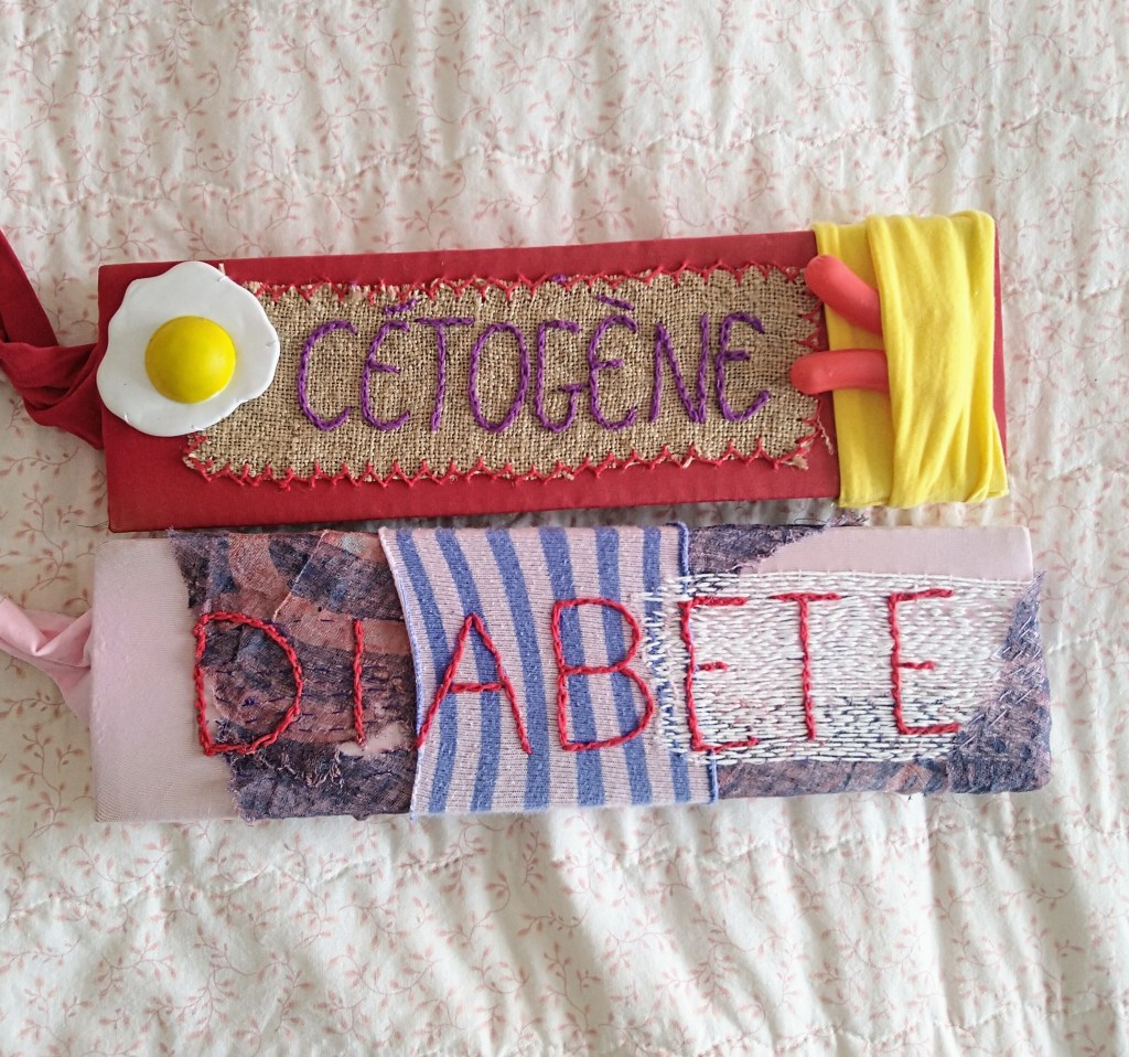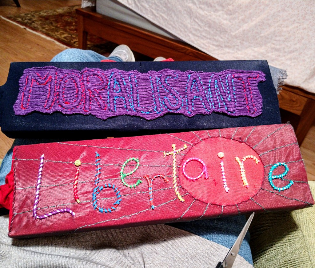 This textile installation was inspired by thoughts about the ideas circulated by the media which influence us as a society. It is made of fourteen cardboard blocks covered with stockings and embroidered on both faces. The words on the faces designate current trends which I think are here to say (i.e. “heavy” in French). The hanging presentation plays on the idea of heaviness while allowing the viewer to see both sides of the blocks. The blocks, which hang from a blanket on a rectangular frame, are light and mobile.