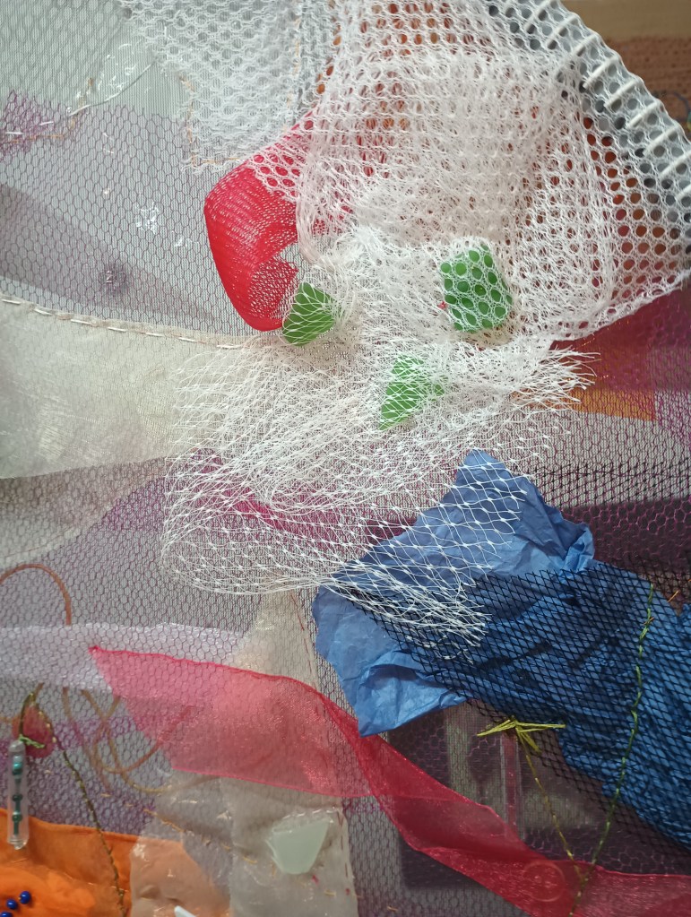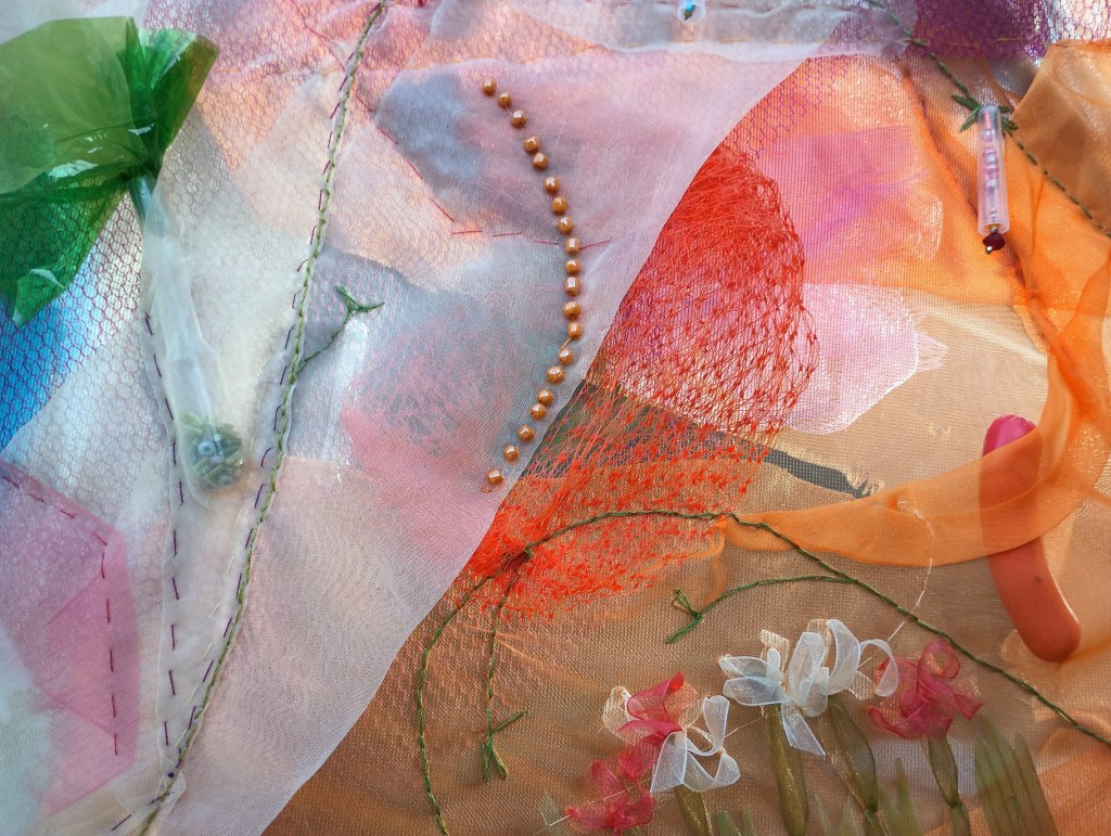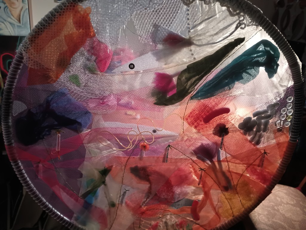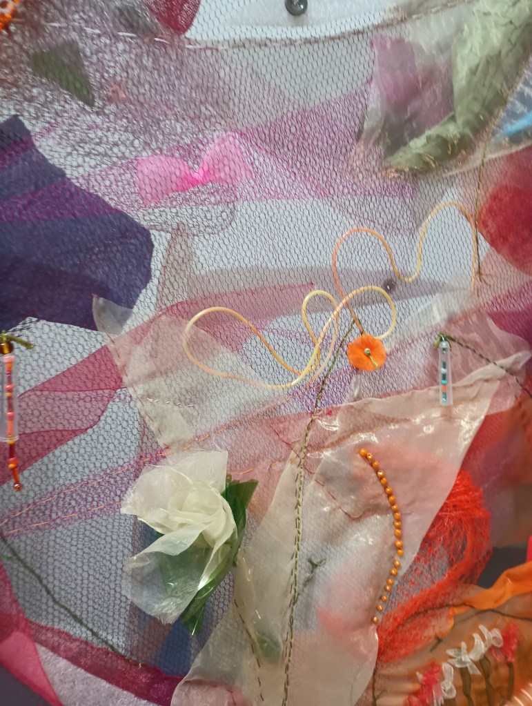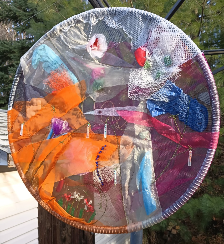Ici j’ai exploré la transparence et les superpositions pour créer une œuvre légère, colorée et fantaisiste qui change d’aspect selon l’éclairage et l’arrière-plan. Pour la faire plus grande, j’ai fabriqué un cerceau en tube de PVC sur lequel j’ai tendu une fine moustiquaire. Tous les tissus et le matériel utilisés sont légers, pour ne pas déformer la moustiquaire, et la plupart sont aussi plus ou moins transparents. Il s’agit de ma première œuvre à deux faces où les défis étaient d’harmoniser la composition des deux côtés et de faire disparaître les détails de finition.