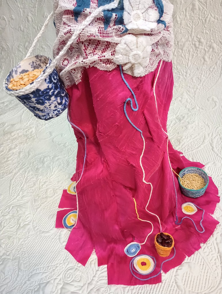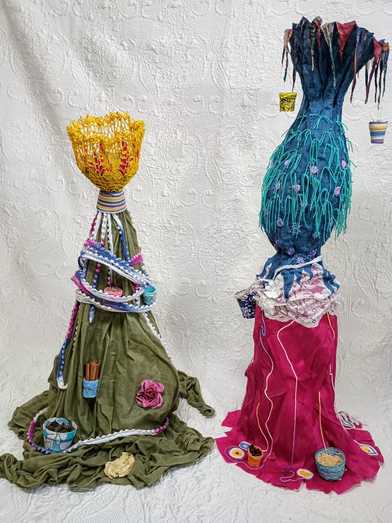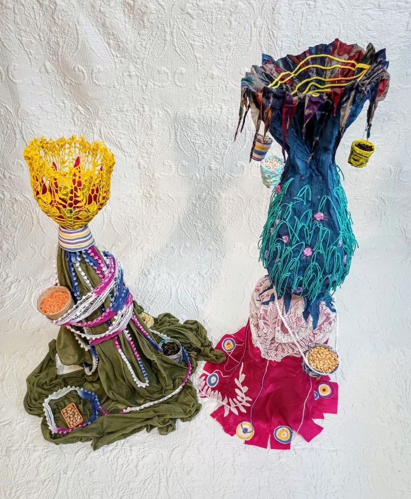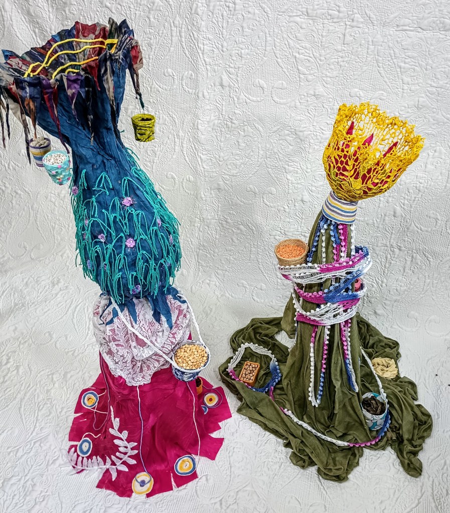 Ces deux figures faites de tissus, de fils et de beaucoup de colle s’inspirent du thème de la nourriture et de celles qui la cultivent et la préparent. Ensemble, elles forment une représentation semi abstraite de deux amies allant au bazar pour vendre les produits de la récolte. La figure de tissu vert mesure 62 cm et son amie rose et bleue mesure 100 cm. Les deux ont une charpente en fil de fer.
