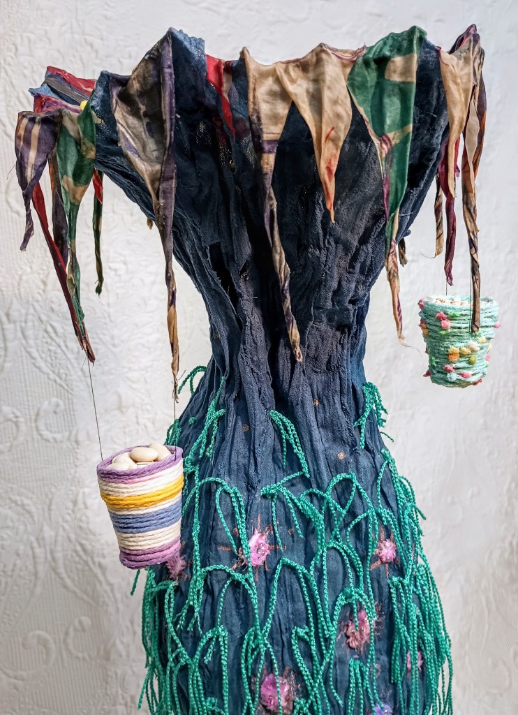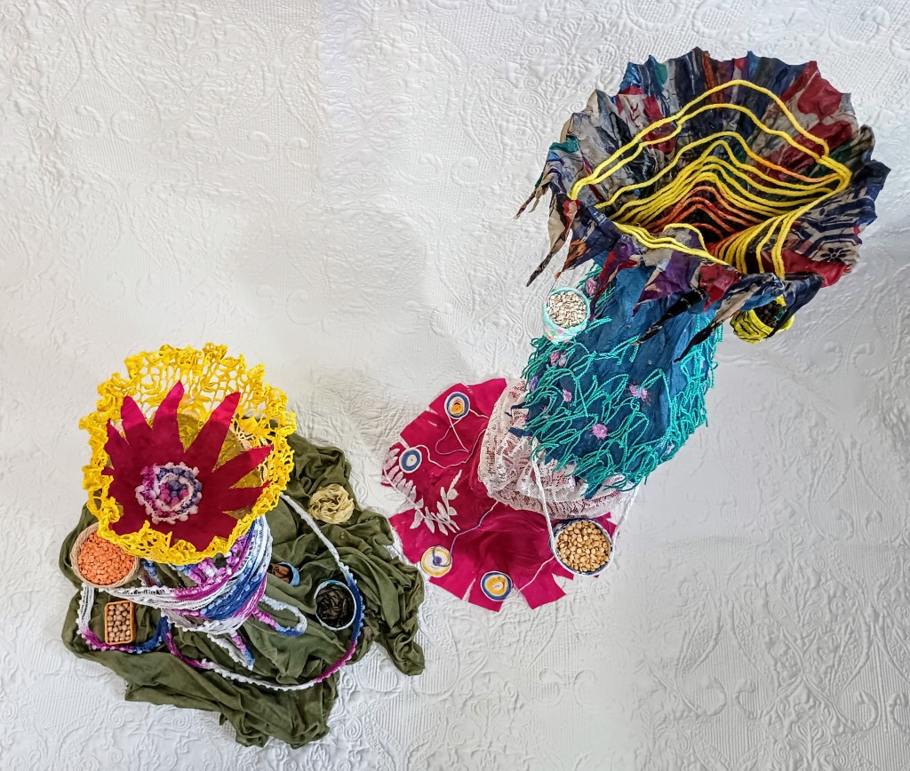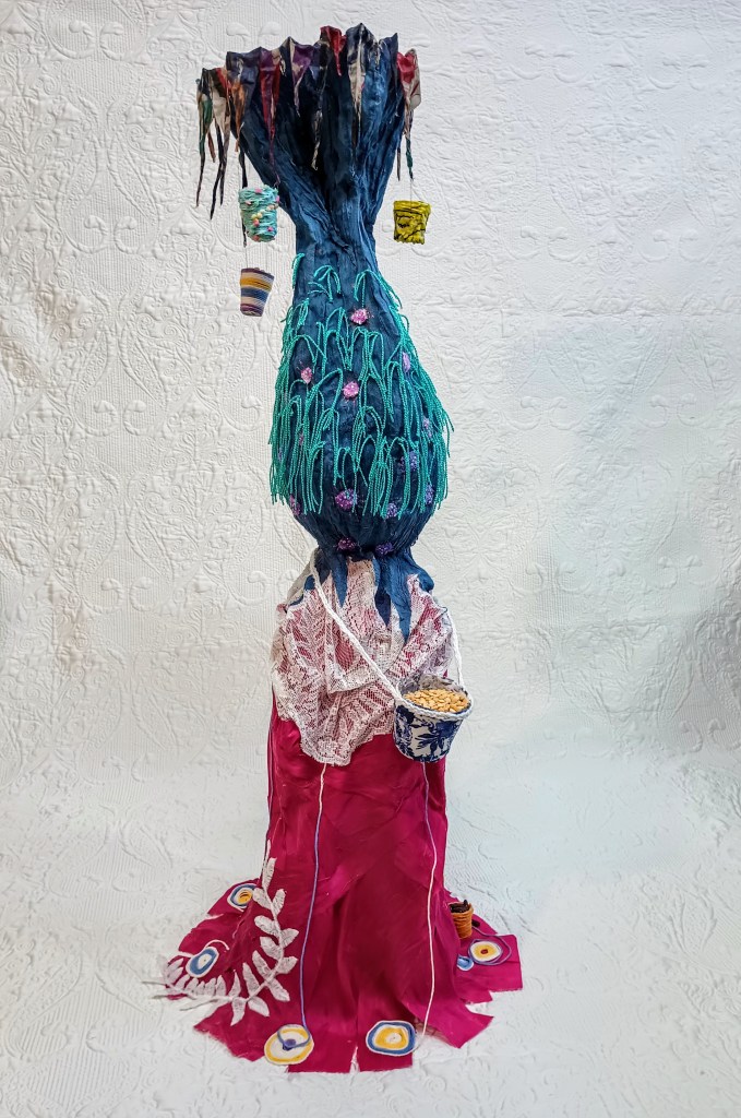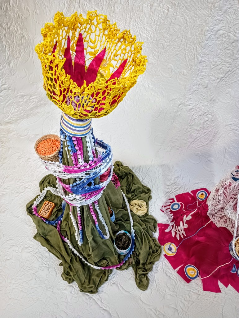 Ces deux figures faites de tissus, de fils et de beaucoup de colle s’inspirent du thème de la nourriture et de celles qui la cultivent et la préparent. Ensemble, elles forment une représentation semi abstraite de deux amies allant au bazar pour vendre les produits de la récolte. La figure de tissu vert mesure 62 cm et son amie rose et bleue mesure 100 cm. Les deux ont une charpente en fil de fer.
