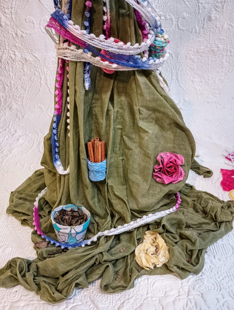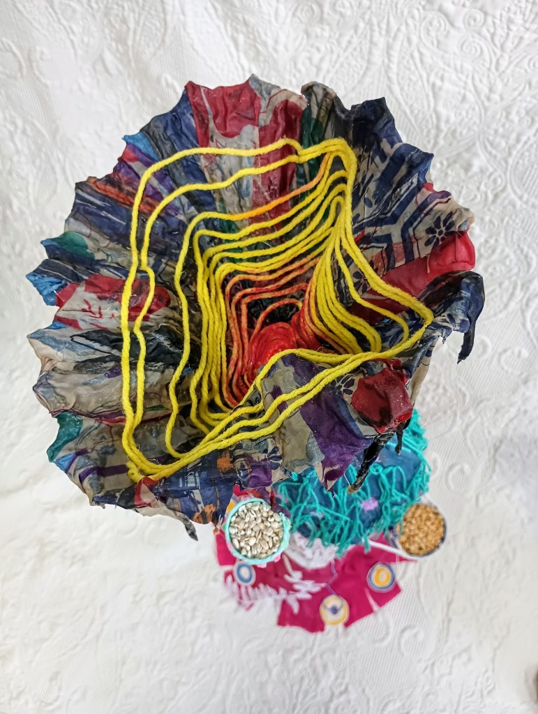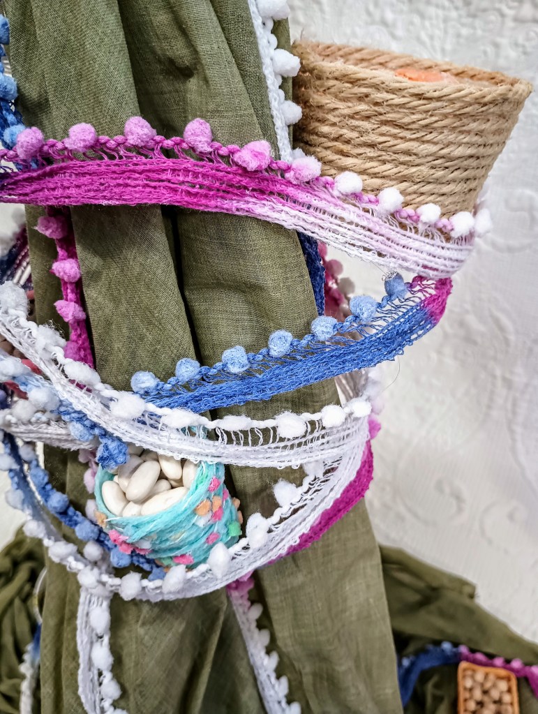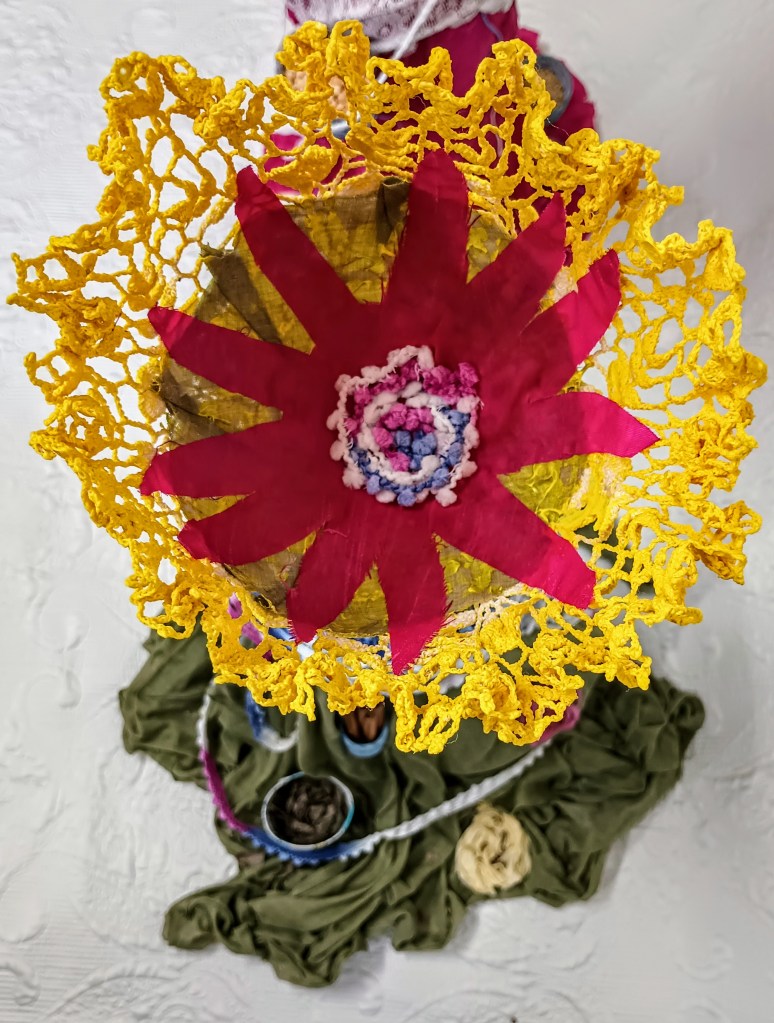 This semi abstract sculpture was inspired by the theme of food and the women who grow it and prepare it. The figures are made of fabrics, yarns and a lot of glue. Together, they represent two women heading to the bazar to sell the product of their gardens. The green figure measures 62 and her pink and blue friend measures 100 cm. Both have an underlying chicken wire frame.