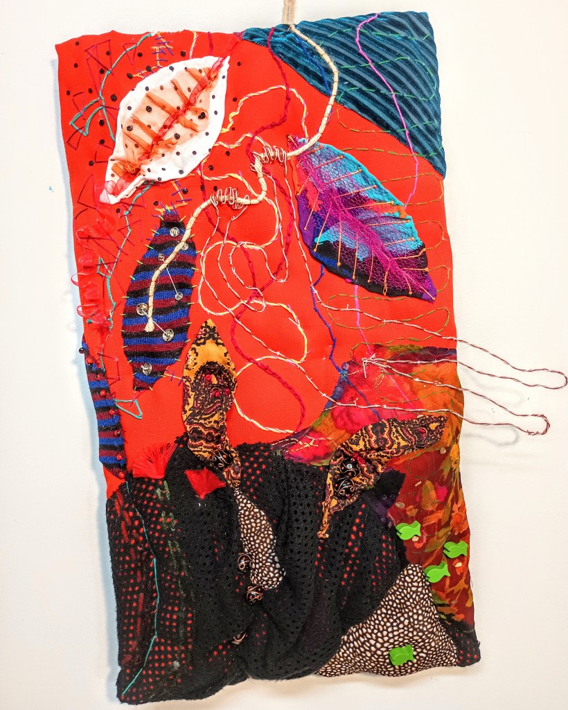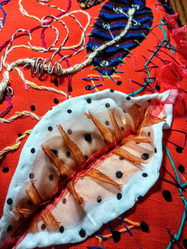 This fifth hanging textile piece is more sculptural than my previous embroidered reliefs in that it is much more textured. Made of batting, fabrics, threads, ribbons and various accessories, it is attached to a rigid but pliable chicken wire backing which made it possible to pull deaper “trenches” into the surface and to “verticalize” certain rigid fabrics.