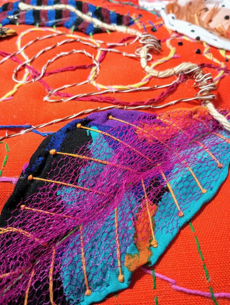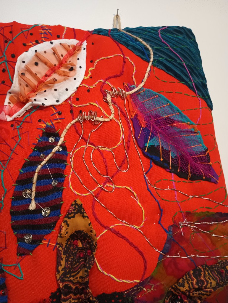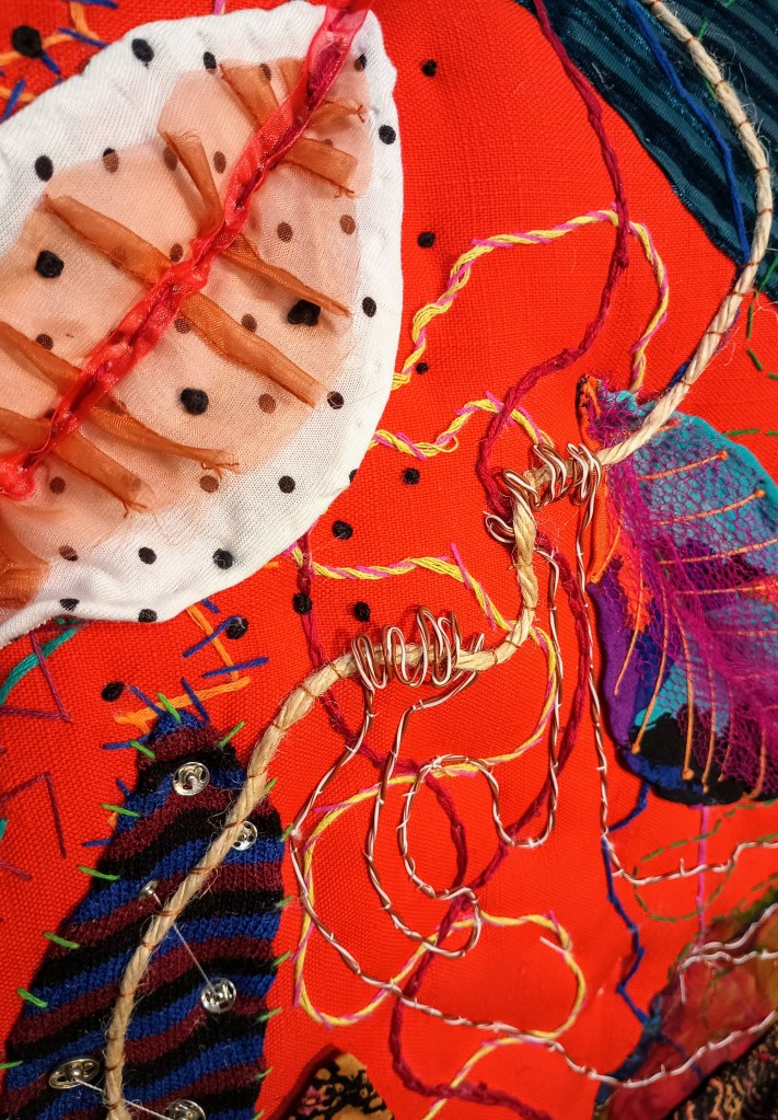 Cette cinquième oeuvre textile murale est plus sculpturale que mes précédents reliefs brodés parce que beaucoup plus texturée. Composée de bourre, de tissus, de fils, de rubans et d’accessoires, elle est fixée à un grillage de poulailler qui permet de creuser la profondeur et de “verticaliser” les tissus plus rigides.